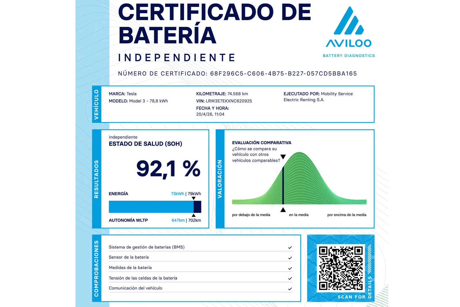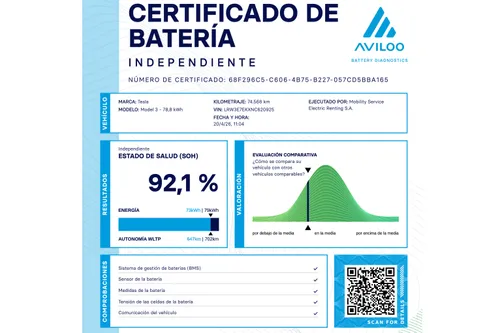 En un vehículo eléctrico ya usado, la clave es verificar el estado de la batería para conocer de antemano su autonomía real estimada. Por eso, todos nuestros vehículos ReDrive cuentan con la certificación de AVILOO, un diagnóstico especializado y reconocido oficialmente para comprobar el estado de salud de la batería (SoH) en vehículos eléctricos, que avala su rendimiento actual y durabilidad. Cuanto mayor es el AVILOO score mejor es el estado de la batería.
